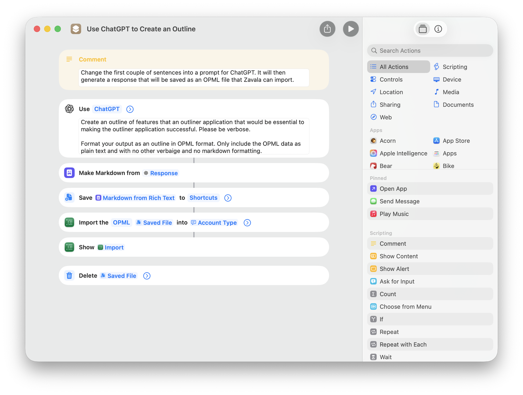Zavala has great Shortcuts support and has for some time. With macOS 26 and iOS 26, Apple added support for utilizing AI models in Shortcuts. You can use these two things together to create outlines using AI. I wrote an example Shortcut, Use ChatGPT to Create an Outline, that does what it says. It even works in older versions of Zavala, you just have to have the most recent Apple operating systems.